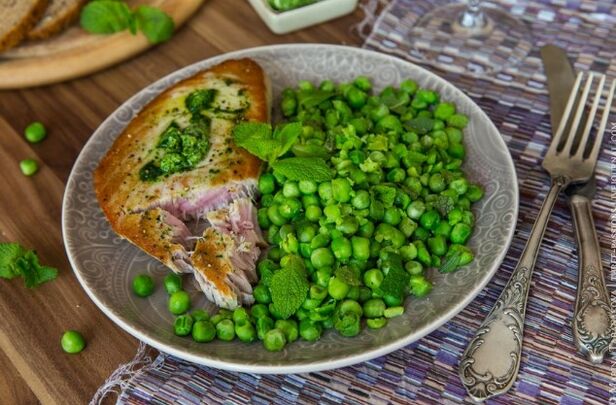 - Lón: 100 gram de phiseanna glasa agus 100 gram de fheoil bruite sicín, turcaí nó coinín;